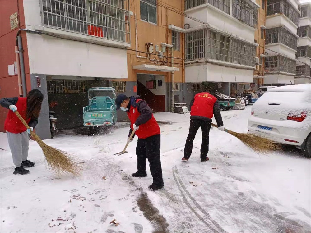 志愿者们躬着身子,握着扫把、铁锹,全力清扫社区主干道上的积雪,经过两个多小时奋战,社区主干道的积雪被清扫干净,保证了道路的安全畅通消除了安全隐患。
